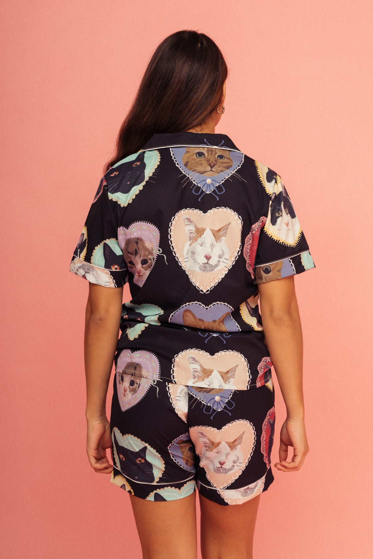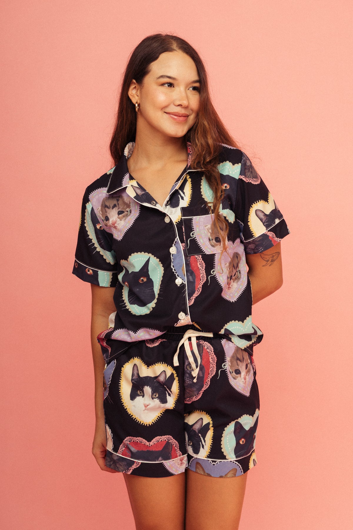 Conjunto de pijama elaborado en Seda Mango 96.05% poliéster y 3.95% elastomero de 95 gramos con silueta semi amplia, textura liviana y fresca. La camisa tiene botonadura plástica sobre toda la perilla y los pantalones y shorts pretina enresortada y cordón ajustable en la cintura.