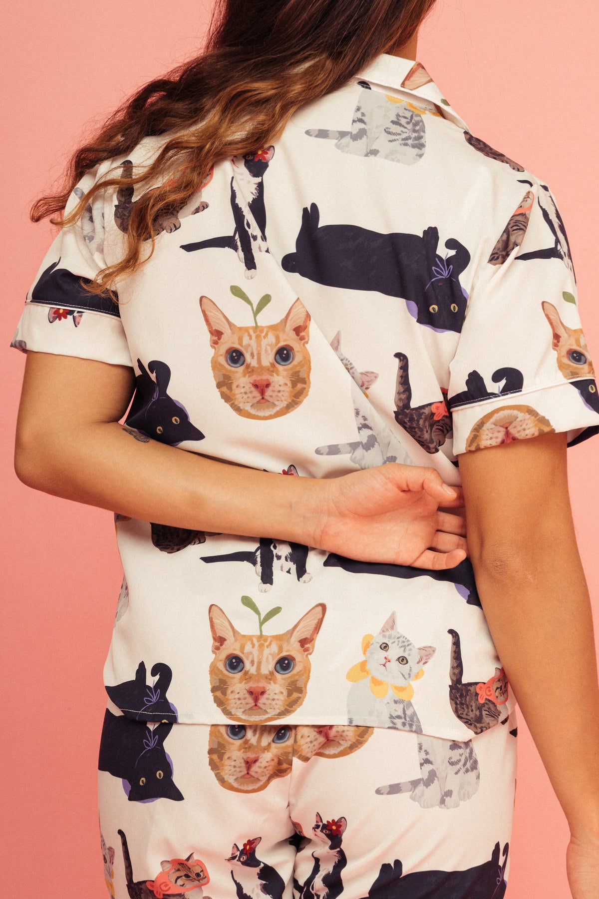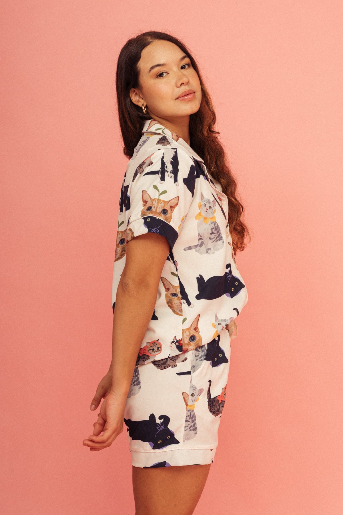 Conjunto de pijama elaborado en Seda Mango 96.05% poliéster y 3.95% elastomero de 95 gramos con silueta semi amplia, textura liviana y fresca. La camisa tiene botonadura plástica sobre toda la perilla y los pantalones y shorts pretina enresortada y cordón ajustable en la cintura.