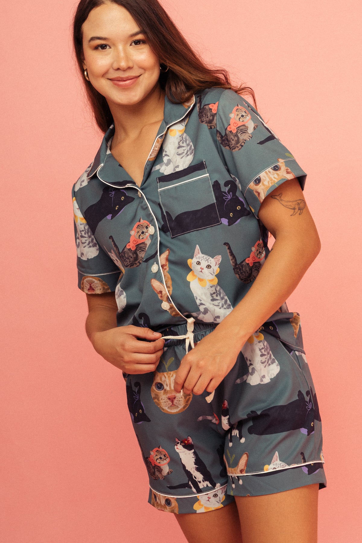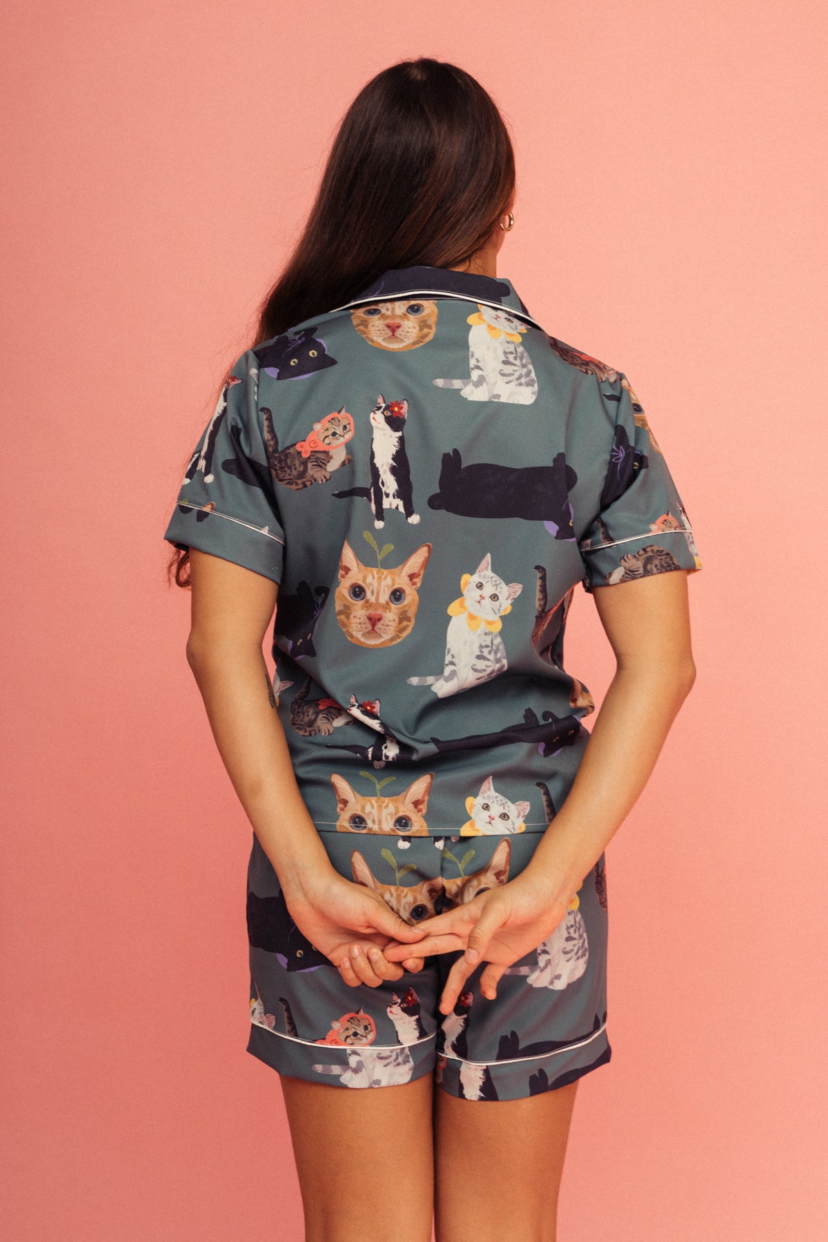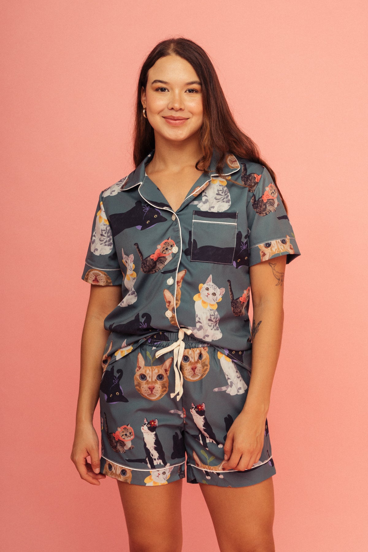 Conjunto de pijama elaborado en Seda Mango 96.05% poliéster y 3.95% elastomero de 95 gramos con silueta semi amplia, textura liviana y fresca. La camisa tiene botonadura plástica sobre toda la perilla y los pantalones y shorts pretina enresortada y cordón ajustable en la cintura.